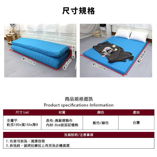 (攤平) 長約 180㎝×寬約 150㎝×厚約 8㎝
