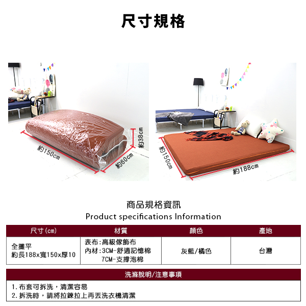 內材: 3CM記憶棉+7CM支撐泡棉
