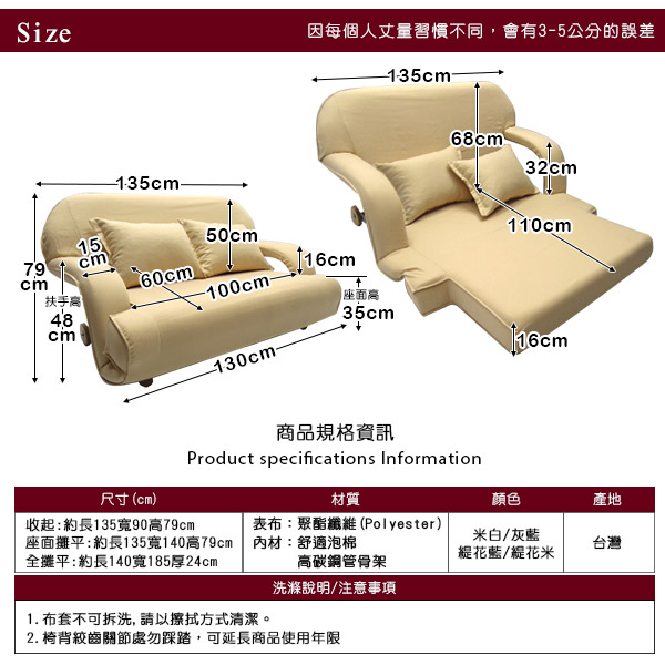 座面:高約35cm 深約60cm 寬約130cm(含扶手)/100cm(不含扶手)