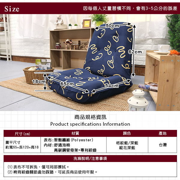 全長(攤平):長約120公分/寬約65公分/椅厚約18公分