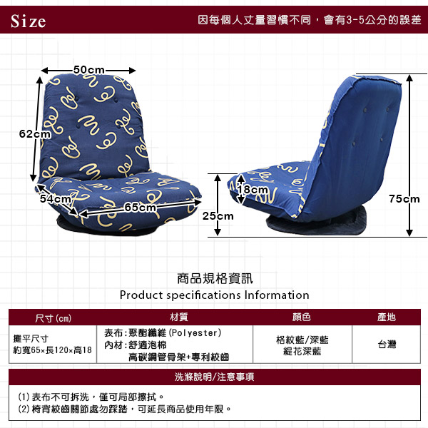 全長(攤平):長約120公分/寬約65公分/椅厚約18公分/椅高約25公分