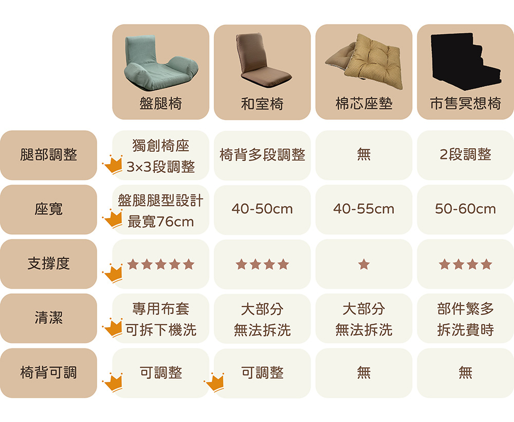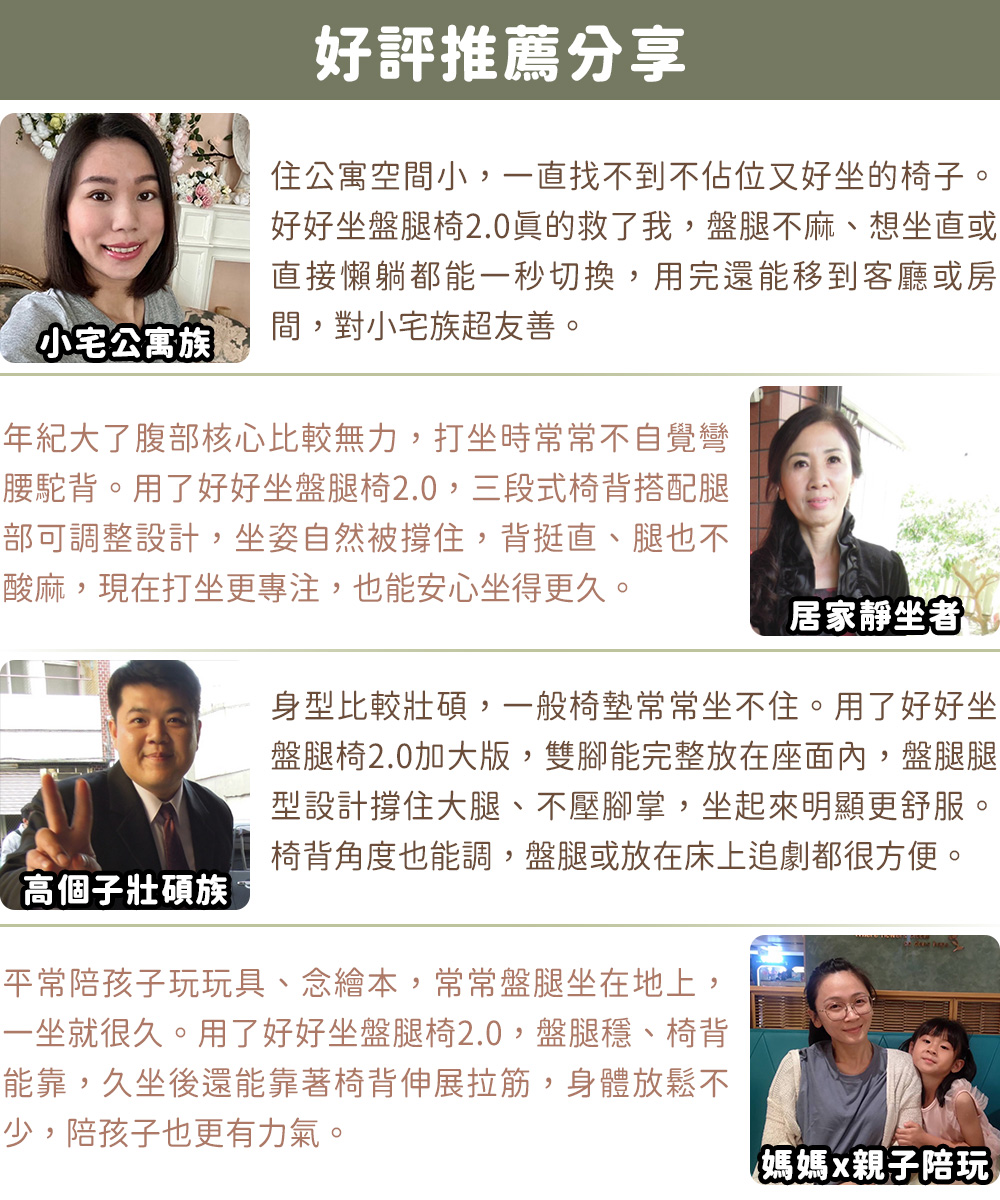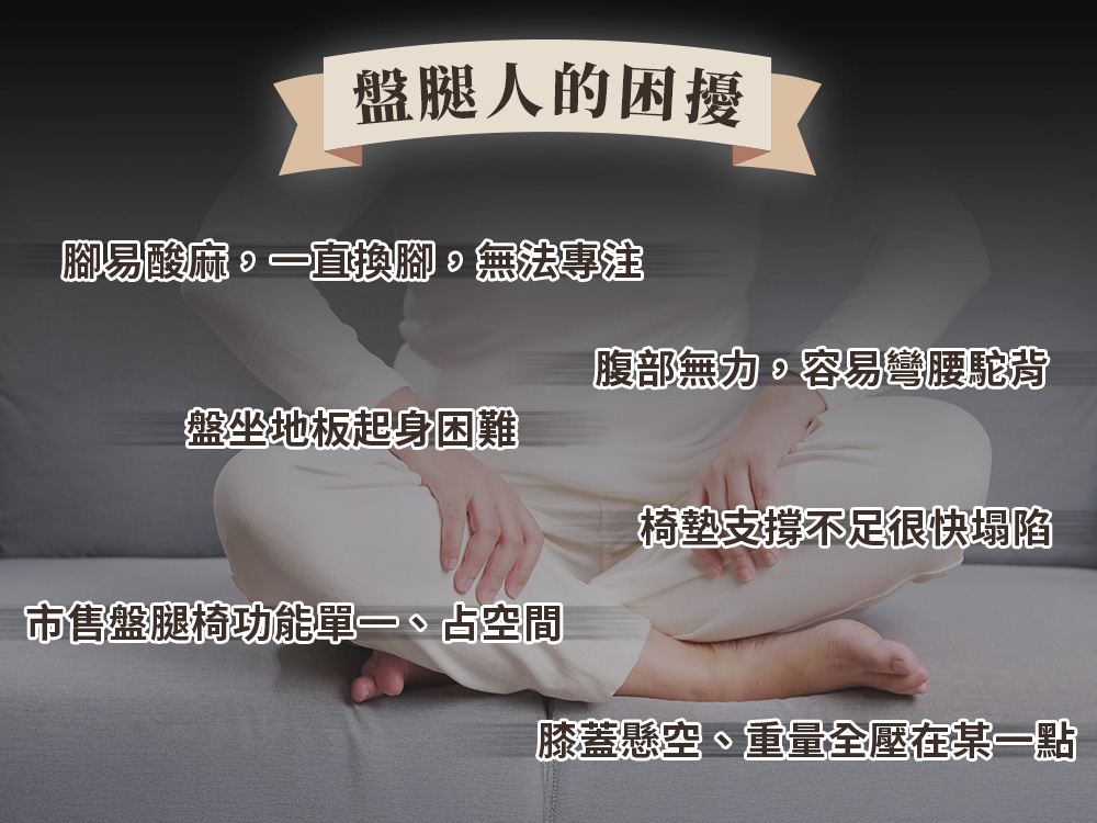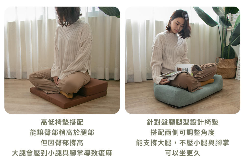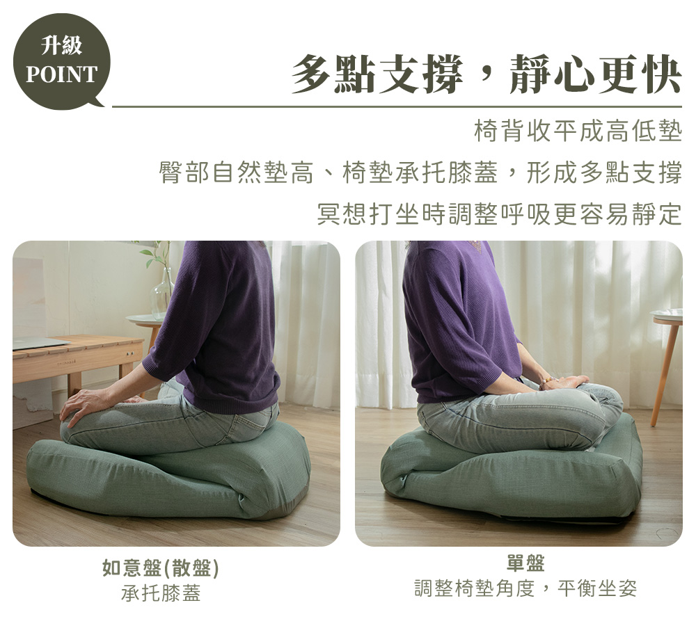 專為盤腿腿型設計,多段式調整支撐大腿,腳掌擁有舒適擺放空間,不壓不酸不麻好自在。