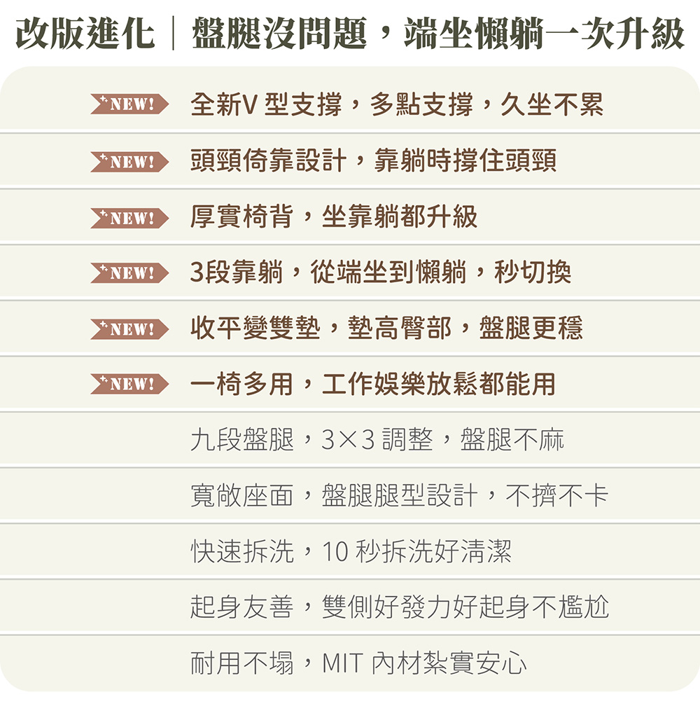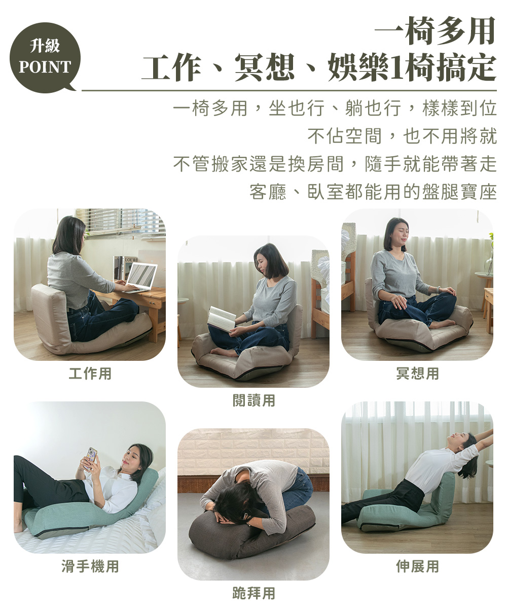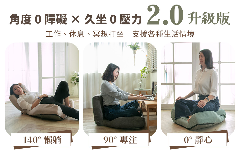 全新進化💖 厚度進化!支撐進化!角度也進化🔥 專為盤腿人而生,結合 3×3 腿部調整 × 3 段椅背角度,打造多點支撐結構,讓身體自然端坐、不再集中壓迫單一部位,背不駝、腿不麻,盤腿也能久坐舒適。 冥想、工作、追劇、吃飯一椅切換!