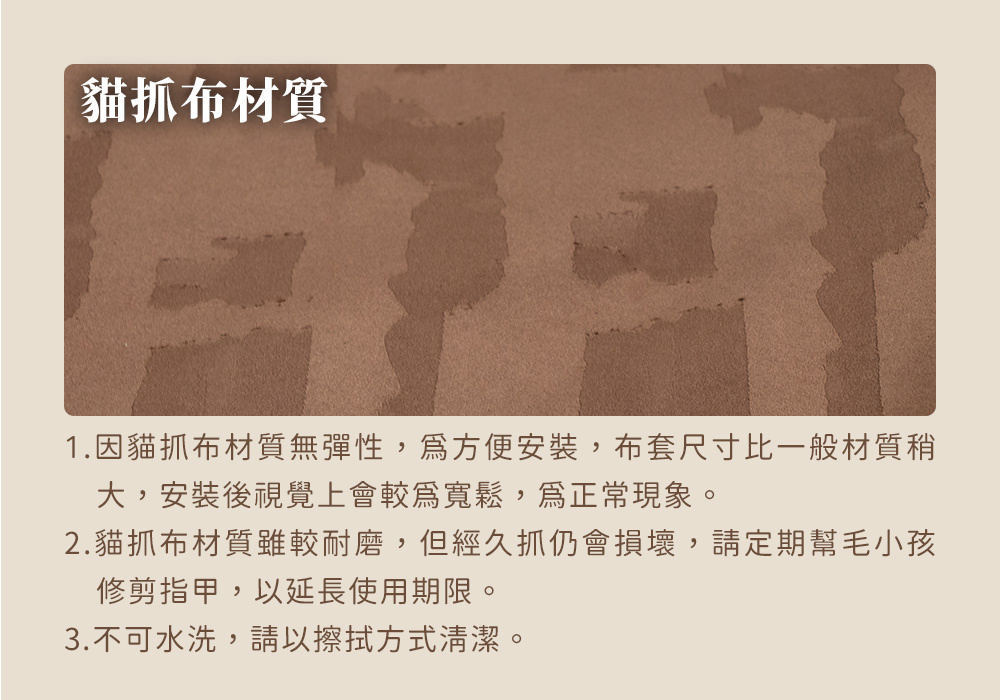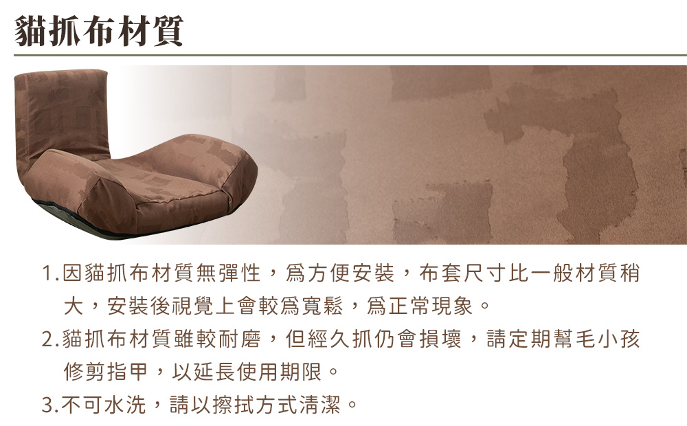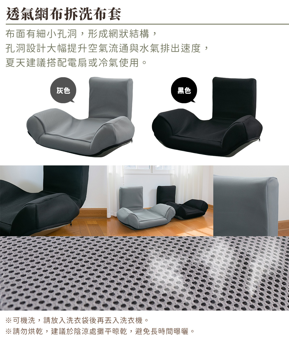布料採用防潑水設計,打翻飲料輕鬆擦拭即可。專用布套拆卸便利,U型拉鍊設計,10秒快速拆卸。