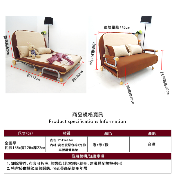 (1)可拆洗,但須卸除所有零件,建議使用擰乾抹布或沙發清潔劑清潔。